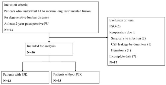 The inclusion criteria were as follows: (1) preoperative diagnosis of degenerative lumbar diseases (spinal stenosis, spondylolisthesis, adjacent segment disease following previous spinal fusion, lumbar degenerative kyphosis); (2) completion of a long-segment spinal instrumented fusion surgery from L1 vertebra to the sacrum regardless of iliac fixation; and (3) a postoperative follow-up period of at least 2 years. The exclusion criteria were as follows: (1) sagittal balance as C7 sagittal vertical axis (C7SVA) more than 15 cm on lateral whole spine radiograph in standing position; (2) inadequate visibility for measuring radiographic parameters in whole spine standing lateral radiographs at regular pre- and postoperative visits; (3) history of pedicle subtraction osteotomy (PSO) or other equivalent procedures; (4) postoperative surgical site infection requiring revisional operation for index surgery, but not for PJF; and (5) if they lacked either baseline or postoperative imaging at regular (preoperative, postoperative 3 months, 1-year and 2-year) follow-up (Figure 1).