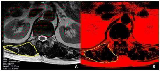 The following demographic and surgical data were collected: age at surgery; sex (female/male); bone mineral density (BMD, T-score); body mass index (BMI, kg/m2); smoking; previous spinal fusion; American Society of Anesthesiologist physical status (ASA) grading; iliac fixation; disc degeneration by Pfirrmann grade [] at T12-L1 segment (1,2,3: mild to moderate; 4,5: severe); muscularity status at T12-L1 (cross-sectional area [CSA], cm2); and fat infiltration grade (mild to moderate, if <50%; severe, if ≥50%) in erector spinae muscle at T12-L1 in T2-weighted axial magnetic resonance (MR) images using Picture Archiving and Communication System (PACS) by Philips ACHIEVA 3.0T (Philips Healthcare, West Sussex, UK) and the ImageJ for windows (National Institutes of Health, Bethesda, MD, USA, V 1.8.0). The region of interest (ROI) for erector spinae muscle at the T12-L1 level was outlined polygonally with the manipulation of a graphic cursor and was handled with the pseudocoloring method [] (Figure 2). Then, CSAs (Figure 2A) were calculated, and the fat infiltration grade (Figure 2B) was determined.