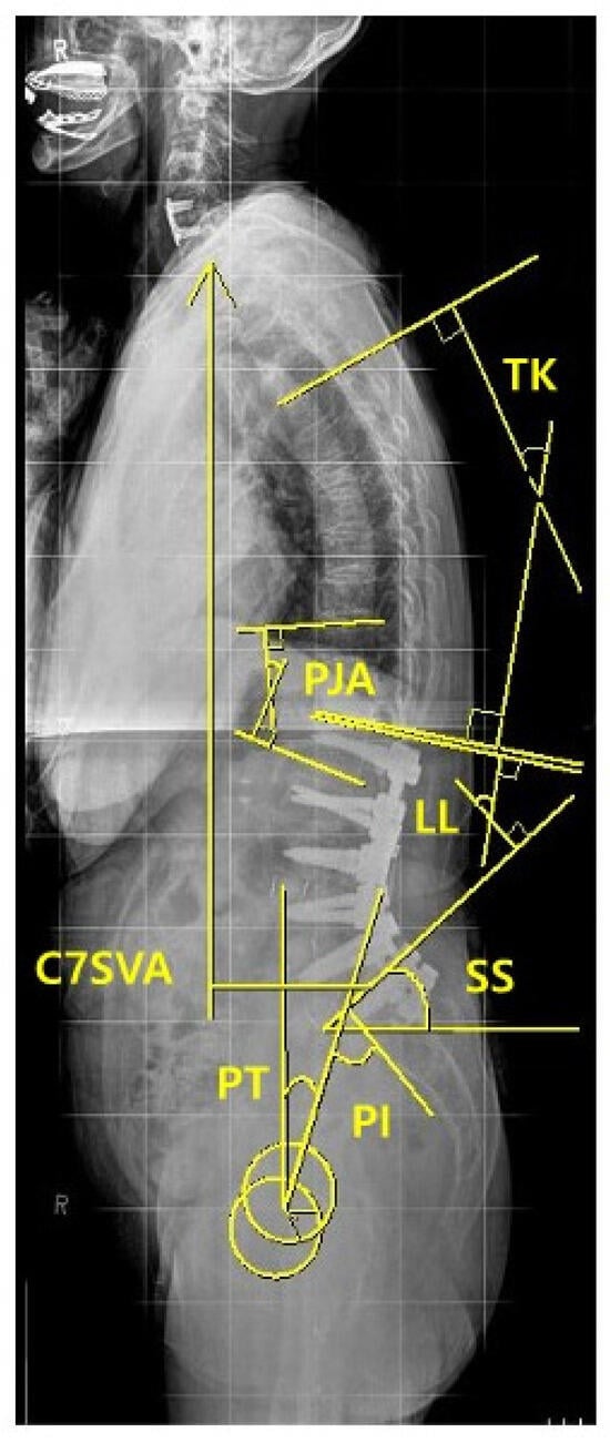 For the radiographic assessment of spinopelvic parameters, standing 36-inch-long cassette AP and lateral radiographs of the whole spine were measured at the preoperative, immediate postoperative, and regular postoperative outpatient visits (3, 6, 9 months, and 1-year, 2-year, and the final follow-up), respectively. On the radiographs, C7 sagittal vertical axis (C7SVA), thoracic kyphosis (TK) [], thoracolumbar kyphosis (TLK) [,], lumbar lordosis (LL) [], sacral slope (SS) [], pelvic tilt (PT) [], pelvic incidence (PI) [,,], and proximal junctional angle (PJA) were measured (Figure 3). We also collected and analyzed the change (preoperative minus postoperative) of each radiographic parameter between the preoperative and the immediate (3 months) postoperative.