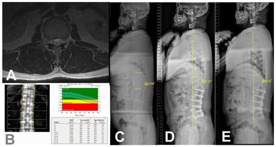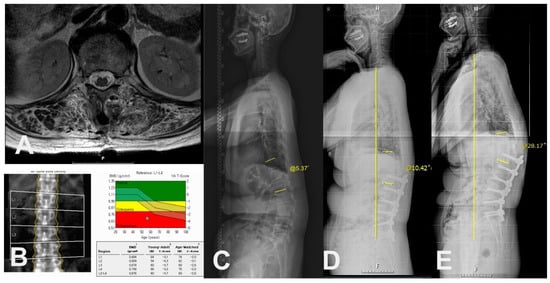 A case of a 73-year-old female patient without PJK. (A) Preoperative axial T2-weighted magnetic resonance image showing erector spinae muscle with minimal fat infiltration at T12-L1 level. (B) Preoperative BMD showing no osteoporosis. (C) Preoperative whole spine standing lateral radiograph showing PJA of 3.56°. (D) Postoperative 3-month whole spine standing lateral radiograph showing PJA of 7.37°. (E) Postoperative 3-year standing lateral whole spine radiograph showing PJA of 8.14° with maintained C7SVA.