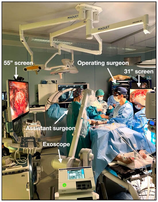 - Ferreira, T.; Roy, S.; Tan, J.K.; Awuah, W.A.; Shet, V.; Adebusoye, F.T.; Nicolas, A.; Abdul-Rahman, T.; Aderinto, N. Exoscope-assisted spine surgery: Current applications and future directions. World Neurosurg. X 2024, 23, 100335. [Google Scholar] [CrossRef] [PubMed]