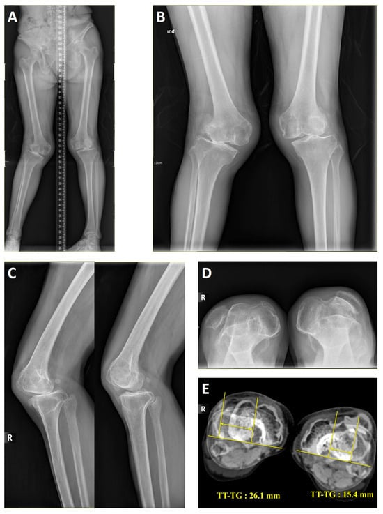 (A–E). Bilateral secondary osteoarthritis with neglected dislocation of the patella in a 68-year-old female patient (Cases No. 1 and No. 2): (A) long-leg standing anteroposterior view; (B) standing anteroposterior view; (C) lateral view of right and left knees; (D) skyline view; and (E) rotational computed tomography image showing the tibial tuberosity–trochlear groove (TT-TG) distance.
