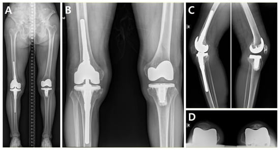 All surgical procedures were performed using a conventional technique (Figure 2). After an anterior midline skin incision, a medial parapatellar arthrotomy was performed. The meniscotibial part of the deep medial collateral ligament (MCL) was released as a preliminary step, which was performed minimally because of the stretched medial structures due to valgus deformity. Both cruciate ligaments were resected in all cases. The choice of implants was based on the surgeon’s preference at the time of surgery, including the following systems: Triathlon (Stryker, Mahwah, NJ, USA), LPS, LCCK, Persona (Zimmer Biomet, Warsaw, IN, USA), and Attune (DePuy Synthes, Warsaw, IN, USA). An intramedullary guide was used for distal femur resection, while an extramedullary guide was used for proximal tibia resection. The bone cutting was made perpendicular to the mechanical axis of the femur and the tibia and planned from long-leg films taken preoperatively.