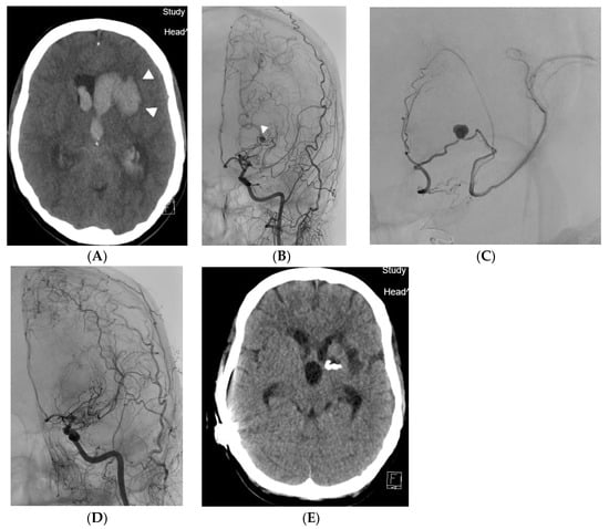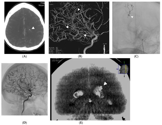 - Yamada, H.; Saga, I.; Kojima, A.; Horiguchi, T. Short-Term Spontaneous Resolution of Ruptured Peripheral Aneurysm in Moyamoya Disease. World Neurosurg. 2019, 126, 247–251. [Google Scholar] [CrossRef] [PubMed]