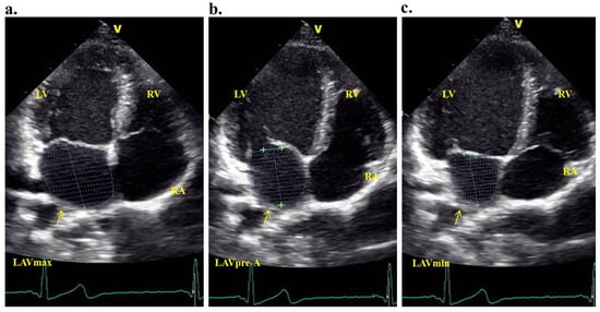 Simultaneously with the echocardiography, an electrocardiogram was recorded. Measurements were documented over three consecutive cardiac cycles. All atrial volumes were derived from the apical four-chamber perspective. When outlining the boundaries, we encompassed the left atrial walls, excluding the pulmonary veins and the left atrial appendage. The left atrial volume index (LAVI) was determined by dividing the left atrial volume by the body surface area of the patient. We computed the maximum left atrial volume (LAVmax), the minimum left atrial volume (LAVmin), and the precontraction left atrial volume (LAVpreA) (Figure 2a–c).