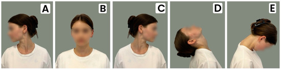 (A)—head rotated to the right; (B)—standard (physiological) anatomical head and neck position; (C)—head rotated to the left; (D)—position of maximum extension; (E)—position of maximum flexion.