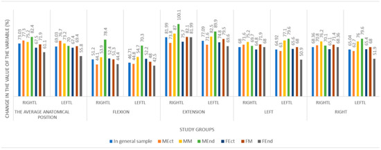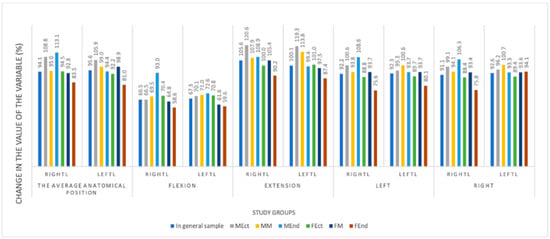 Head extension increases the value of the studied variable in all study groups, except for the group of males with an endomorphic body type, in which this value decreases by 4.42%. Its maximum values were found in males with an ectomorphic body type (120.6 mm); its minimum values were found in endomorphic females (90.2 mm). The greatest changes were recorded in the examined male mesomorphs; it increased by 12.6%.