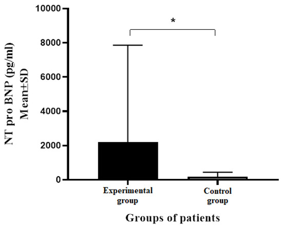 Statistically more significant differences in the average values of NT pro BNP were noted between the experimental and control groups of patients (p < 0.001). The patients from the experimental group had significantly higher average values of NT pro BNP compared to subjects from the control group (2184.57 ± 5672.14 pg/mL vs. 179.93 ± 264.50 pg/mL, respectively) (Figure 1).
