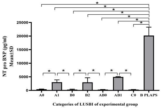 Average values of NT pro BNP in experimental group between groups of patients divided according to LUSBI protocol. AV—Average Value, SD—Standard Deviation; Kruskal–Wallis test with additional Dunn–Bonferroni post hoc analysis, * p < 0.001.