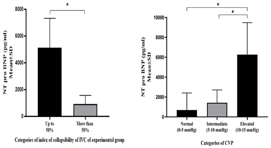 Within the experimental group, significant differences were observed in the NT pro BNP values according to the LUSBI profiles. No statistically significant differences were observed within the control group. The experimental group of patients who had an IVC collapsibility index less than 50% had a higher average value of NT pro BNP compared to subjects whose collapsibility index values were more than 50% (5117.00 ± 2200 pg/mL vs. 927.81 ± 631.22 pg/mL; p < 0.001) (Figure 2 and Figure 3).