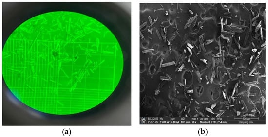 The compound’s image were examined using an optical microscope and scanning electron microscopy (SEM) with an accelerating voltage of 15 kV (APREO FEI, Houston, TX, USA). Prior to SEM observation, the samples were mounted on a carbon-taped stub and coated with platinum for 80 s under vacuum conditions.