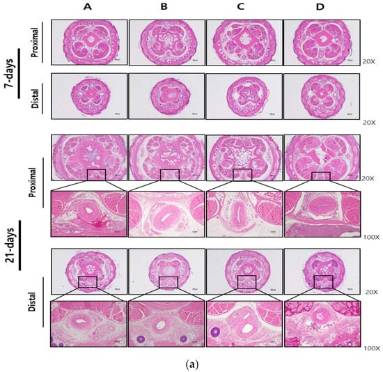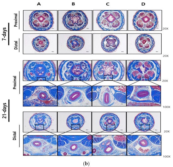Histopathological observations of proximal and distal sections of the middle part of the rat tail stained with (a) Hematoxylin and eosin and (b) Masson’s trichrome, 7 days (upper panel) and 21 days (lower panel) after injection of the embolic substances. Group A: Cilastatin + D-Mannitol Mixture, Group B: Iohexol, Group C: Prepenem, Group D: EGgel. Magnifications: 20× (scale bar is 500 µm), 100× (scale bar is 100 µm).