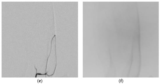 The embolotherapy effect of the embolic agent was evaluated using rabbits because the rabbit’s ear artery is wide and highly visible. The distribution pattern of the embolic agents (contrast solution mixture) in the ear artery of New Zealand white rabbits is evaluated based on the distribution time through micro-CT (C-Arm) imaging. The rabbits were anesthetized with an appropriate intravenous injection of an anesthetic and placed on the operating table. The rabbit’s left ear hair was shaved using an electric shaver and then disinfected. After making an incision in the skin near the base of the ear, the central artery of the ear is identified. A 22G IV catheter is inserted into the ear artery of the rabbit, and the test drug suspension (0.8 mL) is gradually infused from the base of the ear through the central artery. The left and right panels of Figure 3 show results approximately 10~55 s and 120 s after test drug administration, respectively. Figure 3a,b are images after the administration of the contrast solution (iohexol); the iohexol image disappeared at 10 s and, the image was checked up to 120 s. Figure 3c,d are images after the administration of the positive control drug (prepenem), and the drug was clearly contrasted at 55 s; it was hardly visible at about 60 s. Figure 3e,f are images after the administration of the test drug (Cilastatin/D-Mannitol). The test drug began to contrast around 40 s, and by 120 s, there was no contrast at all. Thus, the test drug can be considered suitable as a temporary contrast agent that demonstrates the intended short-term contrast effect.