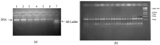 (a) A picture of 1% agarose gel showing positive DNA bands on gel electrophoresis. (b) A picture of 2% agarose gel showing 325 bp fragments on gel electrophoresis amplified using a PCR.