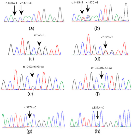 The electrochromatogram shows SNVs in GLO1 and ACE genes. (a,c,e,g) are wild-type sequences, while (b,d,f,h) show mutated sequences (A = Green, G = Black, T = Red, C = Blue).