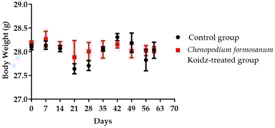 Aged 2-year-old BALB/c mice with 25–30 g body weight were chosen in this study. Body weight was monitored weekly and divided into non-treated as the control group and the C. formosanum-treated group. The C. formosanum treatment group did not change significantly in terms of body weight compared to the control group, as can be observed in Figure 1.