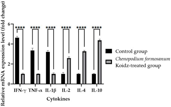 Cytokine fold change (2−(ΔΔCt)) levels in the aged mice. The C. formosanum-treated group had lower levels compared to the control group. The mRNA was extracted from the spleen of the aged mice after 60 days of treatment. Quantifications of the expression of each cytokine, IFN-γ, TNF-α, IL-1β, IL-2, IL-4, and IL-10, were performed using real-time RT-PCR, with β-actin as an internal control. Significant difference (p value < 0.0001) is notated as ****.