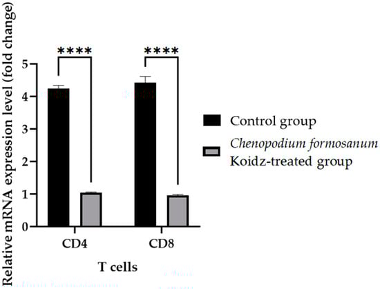 T cell fold change (2−(ΔΔCt)) levels in aged mice. The C. formosanum-treated group had lower levels compared to the control group. The mRNA was extracted from the spleen of the aged mice after 60 days of treatment. Quantifications of the expression of each T cell, CD4 and CD8, were performed using real-time RT-PCR, with β-actin as an internal control. Significant difference (p value < 0.0001) is notated as ****.