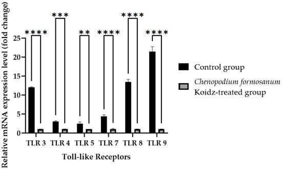 Toll-like receptors (TLRs) are known to play crucial roles in immune responses and have been implicated in the aging process [,,,]. We investigated the potential influence of C. formosanum supplementation on the mRNA expression levels of TLRs. Real-time RT-PCR was performed of the harvested spleen tissues of aged mice who were sacrificed after 60 days of treatment. The results revealed a significant decrease in the mRNA expression levels of TLR3, TLR7, TLR8, TLR9 (p value < 0.0001), TLR4 (p value 0.0001), and TLR5 (p value 0.0057) after treatment with C. formosanum, as can be observed in Figure 4.