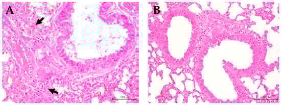 Histopathological image of aged mice lungs at ×400 magnification. (A) Lung section from non-treated aged mice showing hyperplasia of the bronchial epithelium (indicated with arrows, which are infiltrated inflammatory immune cells). (B) Lung section from C. formosanum-treated animals showing a standard histological architecture with no hyperplasia of the bronchial epithelium. The lung samples were stained with hematoxylin-eosin (H&E) stain and were observed under a light microscope.