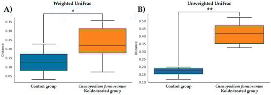 Boxplots of the (A) weighted and (B) unweighted UniFrac distances between the control (indicated by blue color box) and C. formosanum-treated aged (indicated by orange color box) mouse groups. A distance of 0 indicates that the samples are identical, and higher values (up to a maximum of 1) indicate the extent of differences between the compared models. Boxes show the 25th and 75th percentiles, with the median represented by a horizontal line. A significant difference is notated as * (p value < 0.05) and ** (p value < 0.001).