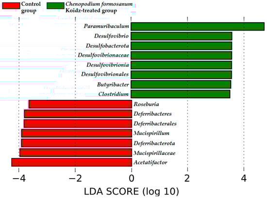 Characterization of microbiomes in the control and C. formosanum-treated aged mouse groups using LEfSe analysis. A histogram of the LDA scores (log10) computed for features with differential abundance. Positive (green) LDA scores implied an increased abundance of taxonomic features in the C. formosanum-treated aged mouse group, while negative (red) LDA scores signified the microbial biomarkers that were enriched in the control aged mouse group.