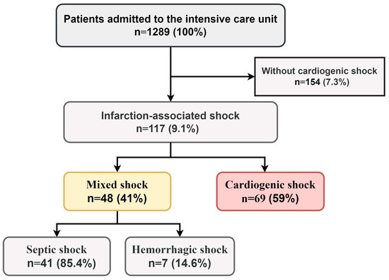 We reviewed 1289 medical records of patients admitted to the emergency cardiology department from 1 January 2020 to 12 December 2020. The study cohort included patients diagnosed with MI-CS within 24 h of hospitalization, according to the International Classification of Diseases, 10th Revision (ICD-10). Patients were subdivided into two groups: Group 1 consisted of those with MI-CS combined with either distributive or hypovolemic shock (termed mixed shock, MS), and Group 2 included patients with isolated CS.