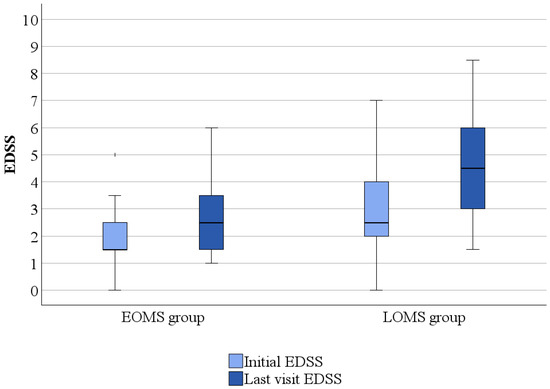 The median EDSS at the baseline for EOMS patients was 1.5 (range of 0–5) and 2.5 (range of 1–6) at the last visit. EDSS at the last visit was higher than baseline EDSS in the EOMS group (p = 0.013). The median EDSS at the baseline for LOMS patients was 2.5 (range of 0–7) and 4.5 (range of 1.5–8.5) at the last visit. EDSS was higher at the last visit compared to the baseline in the LOMS group (p < 0.001). EDSS at the last visit and baseline EDSS were higher in the LOMS group compared to the EOMS group (p < 0.001) (Figure 1).