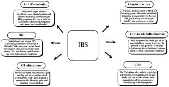 The gut microbiota influences anxiety and stress-related behaviors, with significant differences in microbiome composition found in anorexia nervosa patients compared to healthy controls. (Figure 2 shows an overview of other factors that could be involved in IBS pathogenesis.) Evidence suggests a link between gut microbiota and neurodegenerative illnesses, with certain bacterial species influencing brain health and function [35]. Furthermore, neuropsychological symptoms such as brain fog have been linked to increased SIBO rates, implying a possible gut–brain connection [36].
