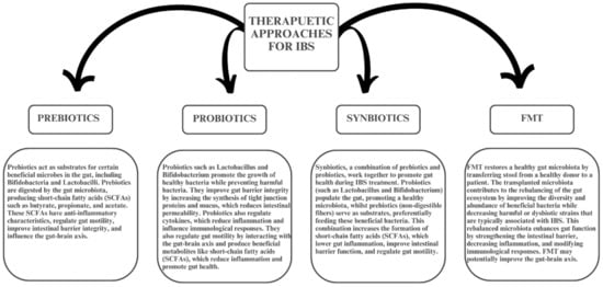 IBS is a multifactorial disorder influenced by a combination of genetic predispositions, gut microbiota alterations, and psychosocial factors. The growing body of evidence supporting the role of the gut microbiota, particularly its involvement in the gut–brain axis, provides valuable insights into the pathogenesis and management of IBS. While microbiota-targeted therapies such as probiotics, synbiotics, and FMT show promise, the variability in patient responses underscores the need for more personalized treatment approaches. Future research should focus on identifying specific microbial signatures that can serve as biomarkers for IBS and exploring the long-term efficacy and safety of these interventions. A more nuanced understanding of the microbiota’s role in different IBS subtypes will be crucial for optimizing individualized therapeutic strategies and improving patient outcomes.