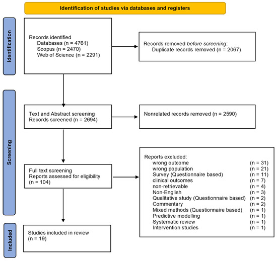 The studies showed the impact of COVID-19 on PLHIV using data obtained from health facility records. A total of 4761 studies were retrieved from the database search of published primary research studies between 2000 and 2024. A total of 2067 duplicates were removed. A total of 2590 unrelated studies were removed, leaving 104 studies for screening. Most of the studies excluded reported the wrong outcomes and, majorly, discussed HIV testing services during the COVID-19 pandemic for other key populations aside from PLHIV. The following studies [26,27] were excluded because the participants’ age was lower than 15 years. A total of 19 studies were included for review, as seen in the PRISMA diagram below (Figure 1).