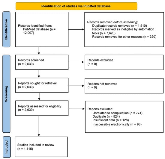From 12,097 results, 1115 were found to be DIM (Figure 1). Data abstraction was performed. The authors read the title and the abstract of all the articles found in the initial search. When provided, we extracted the PubMed identifier (PMID), the main cause of myoclonus, and the year of publication. The data were extracted by two independent authors and double-checked to ensure that they matched.