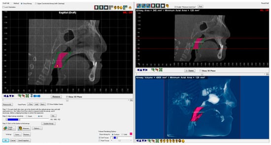 In our study, the segmentation of the pharyngeal airway was conducted separately for the nasopharyngeal, retropalatal, retroglossal, and total volumes, following a methodology similar to that of Pliska et al. []. The literature shows considerable variation in both the number of points and planes used for airway segmentation, as well as the number of segmentation regions employed [,,]. In our study, the selection of points for evaluating the dimensions of the pharyngeal airways was based on criteria such as ease of reproducibility, sensitivity to changes in pharyngeal tissues, and consistency with recent studies [,].