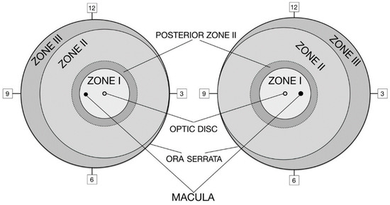 There are three retinal zones centered on the optic disc, according to which the most posterior retinal vascularization or ROP lesion will mark the zone of interest. Posterior zone II describes the region that begins at the margin of zone I–zone II and extends into zone II for two-disc diameters. “Notch” is used to describe an incursion by the ROP lesion of one–two clock hours into a more posterior zone. Plus disease refers to the appearance of dilation and tortuosity of retinal vessels, while pre-plus disease refers to abnormal vascular dilation and/or tortuosity that does not qualify yet as plus disease. Stages 1–3 define the acute disease, stage 4 is characterized by retinal detachment (4A—fovea attached; 4B—fovea detached), and stage 5 is total retinal detachment. Extent is described as the 12 sectors’ clockwise designation. The term “regression” is used to describe the course of ROP after treatment or spontaneous regression, which can be complete or incomplete regression, and “reactivation” is used to describe new ROP lesions or reactivation after laser-therapy or anti-vascular endothelial growth factor (anti-VEGF) treatment [6].