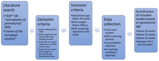 A comprehensive literature search was conducted to compare our findings with previously reported data from Romania and Europe (Figure 2). For Romanian data, we used the search term “ROP incidence and Romania”, also in Romanian (“Retinopatia de prematuritate” and “Romania”). For European data, the search terms included “ROP incidence and Europe”, “ROP incidence”, and “retinopathy of prematurity and Europe”. In addition, search terms for specific European countries were applied, such as “retinopathy of prematurity and Serbia”, “retinopathy of prematurity and Norway”, and similar terms for other countries. The inclusion criteria for the comparative analysis were defined as a maximum birth weight of 2000 g, gestational age below 36 weeks, and a study period ending after the year 2000. Furthermore, studies reporting data on ROP screening, including case numbers screened for ROP, were also considered to be included in this analysis. The exclusion criteria were defined as studies that did not report the number of cases screened as negative for ROP or those that provided detailed data exclusively on treated ROP cases. The data regarding case numbers, ROP incidence, and case selection thresholds are presented in Table 1.