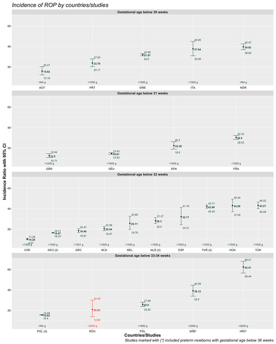The statistical analyses were performed using RStudio (v2024.04.2 + 764) with R (R Core Team 2024, Vienna, Austria) version 4.4.0 [38]. The data were represented either as categorical or as proportions. The confidence intervals of the reported incidences were calculated according to the Agresti–Coull method using the “binom” [39] library. The comparison with an inferential statistical method of the incidences of ROP were performed using the test of proportions with chi-squared distribution, but the research team relied only on the visual comparison by the graphical representation of incidences with confidence intervals. This approach has contributed to the high variability in the studies’ inclusion criteria, especially concerning the birth weight of the infants. Thus, stratification was performed using the reported gestational age thresholds. The graphical representation of the data was performed using the “ggplot2” [40] library. The threshold of significance was set to a p < 0.05 level. The confidence interval levels were set at 95%.
