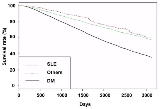 The SLE group showed comparable survival to that of the others group and better survival than that of the DM group.