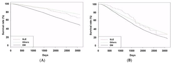 p < 0.001) in the DM group compared to those in the SLE group. Multivariate analysis showed that the hazard ratios were 0.89 (95% CI, 0.71–1.12;