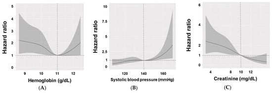 We performed a risk factor analysis for mortality using patients divided by groups. Age, CCI score, hemoglobin, serum creatinine, and SBP were associated with mortality in the SLE group. Spline curves also showed that hemoglobin < 11 g/dL, SBP > 140 mmHg, and serum creatinine < 10 mg/dL were associated with higher mortality in the SLE group.