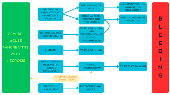 As reported earlier, hemorrhage in patients with pancreatitis may be caused by several conditions [13,21]. Figure 1 summarizes the different pathways involved in the development of bleeding in these patients [29].