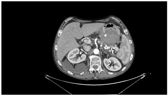 Contrast-enhanced abdominal computed tomography showing active bleeding inside a peripancreatic collection. Reproduced with permission from Bellio, G., et al. [29].