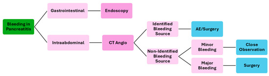 The treatment of acute bleeding secondary to pancreatitis is multifaceted and involves a combination of endoscopic, interventional radiology, surgical, and medical approaches, tailored to the patient’s specific condition and the severity of the bleeding. Figure 3 resumes a possible flowchart for the management of bleeding patients with pancreatitis.