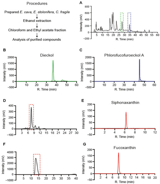 Purification of single compounds from seaweeds: (A) Preparative HPLC separation of (A) phlorotannin from the ethyl acetate fraction of Ecklonia cava (E. cava) and (D,F) chloroform fraction of Ecklonia stolonifera (E. stolonifera) and Codium fragile (C. fragile), respectively. HPLC chromatograms corresponding to purified from (A) to (B) Dieckol (green dashed), and (C) Phlorofucofuroeckol-A (blue dashed), (E) Siphonaxanthin, and (G) Fucoxanthin.
