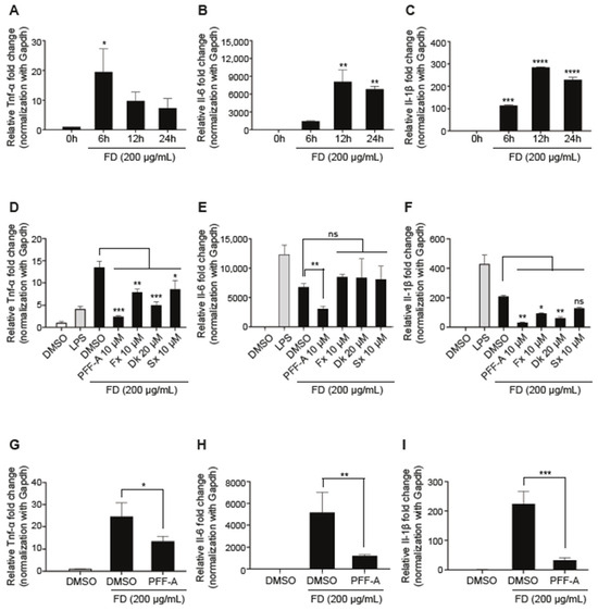 Effects of single compounds against FD-induced pro-inflammatory response: (A–C) RAW 264.7 cells are treated with 200 µg/mL of FD and the expression of pro-inflammatory cytokines was time-dependently measured by qRT-PCR. (D–F) RAW 264.7 cells are pre-treated with purified single compounds for 3 h at the indicated concentrations. After 3 h, the RAW 264.7 cells are stimulated using 1 µg/mL of LPS or 200 µg/mL of FD. The expression of pro-inflammatory cytokines is quantified using qRT-PCR after 24 h of incubation. (G–I) RAW 264.7 cells are pre-treated with 10 µM of PFF-A for 3 h. The expression of pro-inflammatory cytokines is quantified using qRT-PCR after 12 h of LPS or FD stimulation. Data are presented as the mean ± SD. One-way ANOVA with Tukey’s multiple-comparison test is performed to determine the significance (* p < 0.05, ** p < 0.01, *** p < 0.001, ns: not significant).