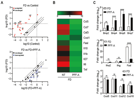 Profiling of inflammation-associated genes in FD-induced macrophage treated with PFF-A. cDNA extracted from FD-induced RAW 264.7 cells treated with/without PFF-A is analyzed simultaneously to profile 84 inflammatory genes by the RT2 profiler PCR assay: (A) The scatter plot shows the up-regulated (red), down-regulated (blue), and unchanged (black) genes. (B) The heat maps present the alteration of inflammatory gene expression. (C) The quantification of Bmp (metabologen), Fasl (apoptotic), Ifnα2 and Ifnγ (Type I interferon), and the C-X-C motif chemokine ligand (chemoattractant). Based on the GeneGlobe database (https://dataanalysis2.qiagen.com/pcr, accessed on 8 February 2024), the heat map for the RT2 profiler PCR assay is generated using GraphPad Prism 7.0 (https://www.graphpad.com/, accessed on 8 February 2024). Data are presented as the mean ± SD. Two-way ANOVA with Sidak’s multiple-comparison test is performed to determine the significance (**** p < 0.0001, ns: not significant).