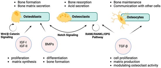 - Transforming growth factor-beta (TGF-β) promotes osteoblast proliferation and differentiation while regulating osteoclast activity through the RANKL/OPG pathway.
