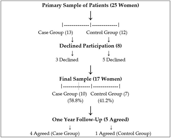 During the study period from 1 January 2021 to 31 December 2021, 3098 women gave birth at the Department of Obstetrics and Gynecology of LUHS KK. A total of 13 (0.4%) of the women experienced OASIS. The primary sample of patients was 25 women (13 women in the case group and 12 in the control group). However, eight participants (three women from the case group and five from the control group) declined to participate in the study. Therefore, the final sample of participants consisted of 17 women: the case group consisted of 10 patients (58.8%), while the control group consisted of 7 women (41.2%). One year after the initial consultation, women were invited to the consultation once again. However, only five of them (four from the case group and one from the control group) agreed to come for a consultation (Figure 1).