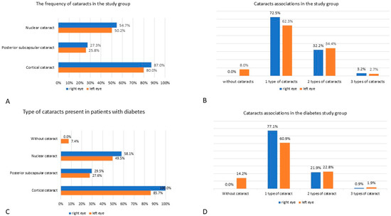The frequencies of different types of cataracts in the studied patients. (A) the frequency of cataracts in the study group. (B) cataracts associations in the study group. (C) type of cataracts present in patients with diabetes. (D) cataracts associations in the diabetes study group.