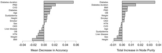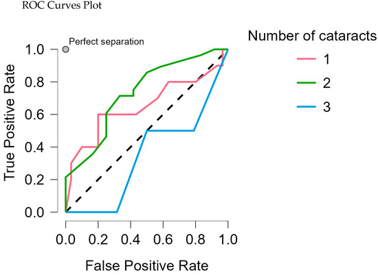 To predict the incidence of different associations of cataracts (1, 2, or 3 types), a Random Forest Classification algorithm was employed to handle complex interactions among a large set of predictor variables: diabetes, age, sex, weight, height, BMI, nutritional status–obesity (OB), smoking, HTN, dyslipidemia, CVD, CKD, liver disease, PND. The model was optimized with respect to the out-of-bag accuracy. The dataset was split into training and testing subsets to validate the predictive model’s performance and ensure that the model generalizes well to unseen data. We calculated accuracy, sensitivity, and area under the Receiver Operating Characteristic (ROC) curve to evaluate the predictive model’s performance with true positive and negative rates across different threshold settings. An AUC value above 0.5 indicated discriminative power. To identify which predictors significantly contribute to predicting cataract associations, we provided the variable importance with mean decrease in accuracy, total increase in node purity, and mean dropout loss. A higher mean decrease in accuracy for a variable suggests that it plays a critical role in the model’s predictions. A higher total increase in node purity for a specific variable suggests that it effectively separates different cataract association classes within the model. A higher mean dropout loss indicates that removing this variable leads to a significant decline in model performance.