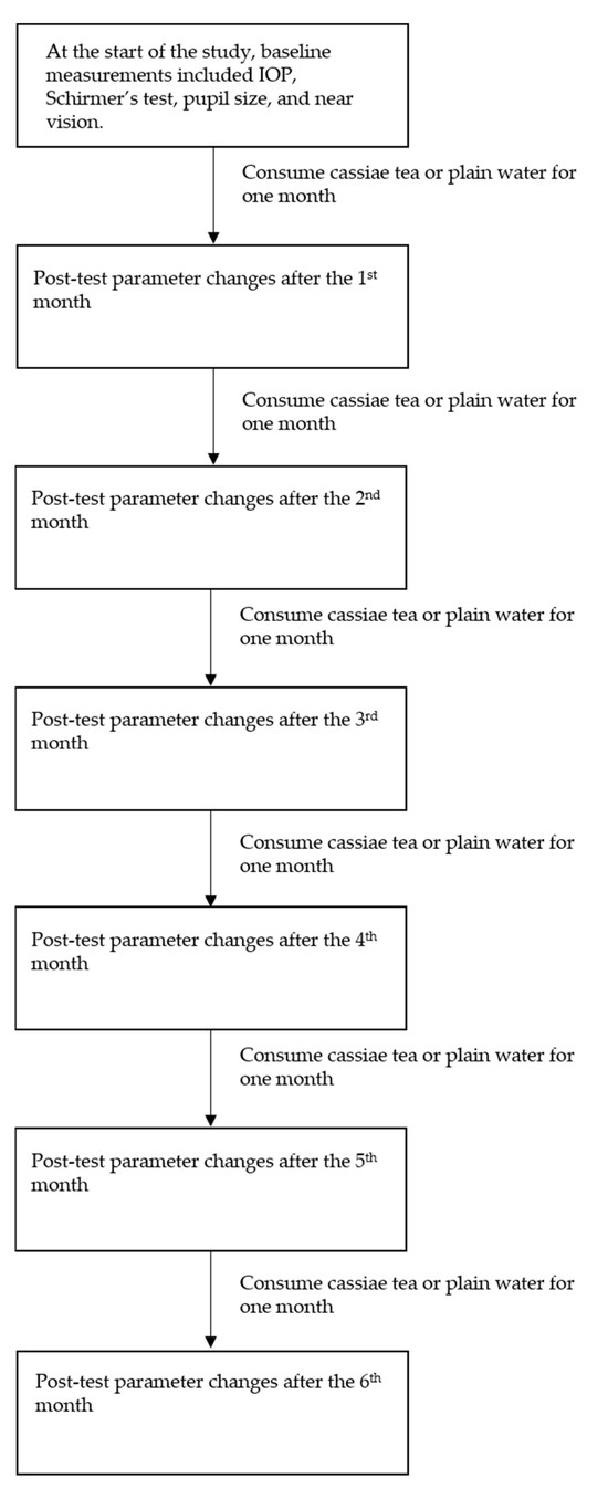 This study comprised a series of experiments aimed at evaluating the effects of cassiae tea on lowering intraocular pressure (IOP), alleviating dry eye symptoms, adjusting pupil size, and improving near vision. A total of 425 eyes from 425 volunteers were enrolled. The study was a controlled, double-blind, randomized trial conducted over six months, with participants instructed to attend regular visits at monthly intervals. Written informed consent was obtained from all participants, and the study was approved by the Institutional Review Board of Kaohsiung Armed Forces General Hospital (approval number: KAFGHIRB 109-019). Additionally, experiments 6 and 7 were conducted in our medical laboratory. All experiments took place between March and September 2021.